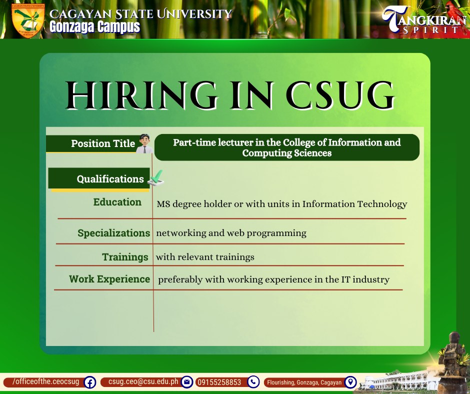 The CAGAYAN STATE UNIVERSITY advocates the Equal Employment Opportunity Principle (EEOP). We encourage and welcome applications from all qualified individuals, regardless of gender, religion, ethnicity, marital status, or disability. All applicants will be evaluated based on their qualifications and merits.