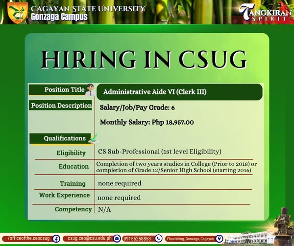 The CAGAYAN STATE UNIVERSITY advocates the Equal Employment Opportunity Principle (EEOP). We encourage and welcome applications from all qualified individuals, regardless of gender, religion, ethnicity, marital status, or disability. All applicants will be evaluated based on their qualifications and merits.